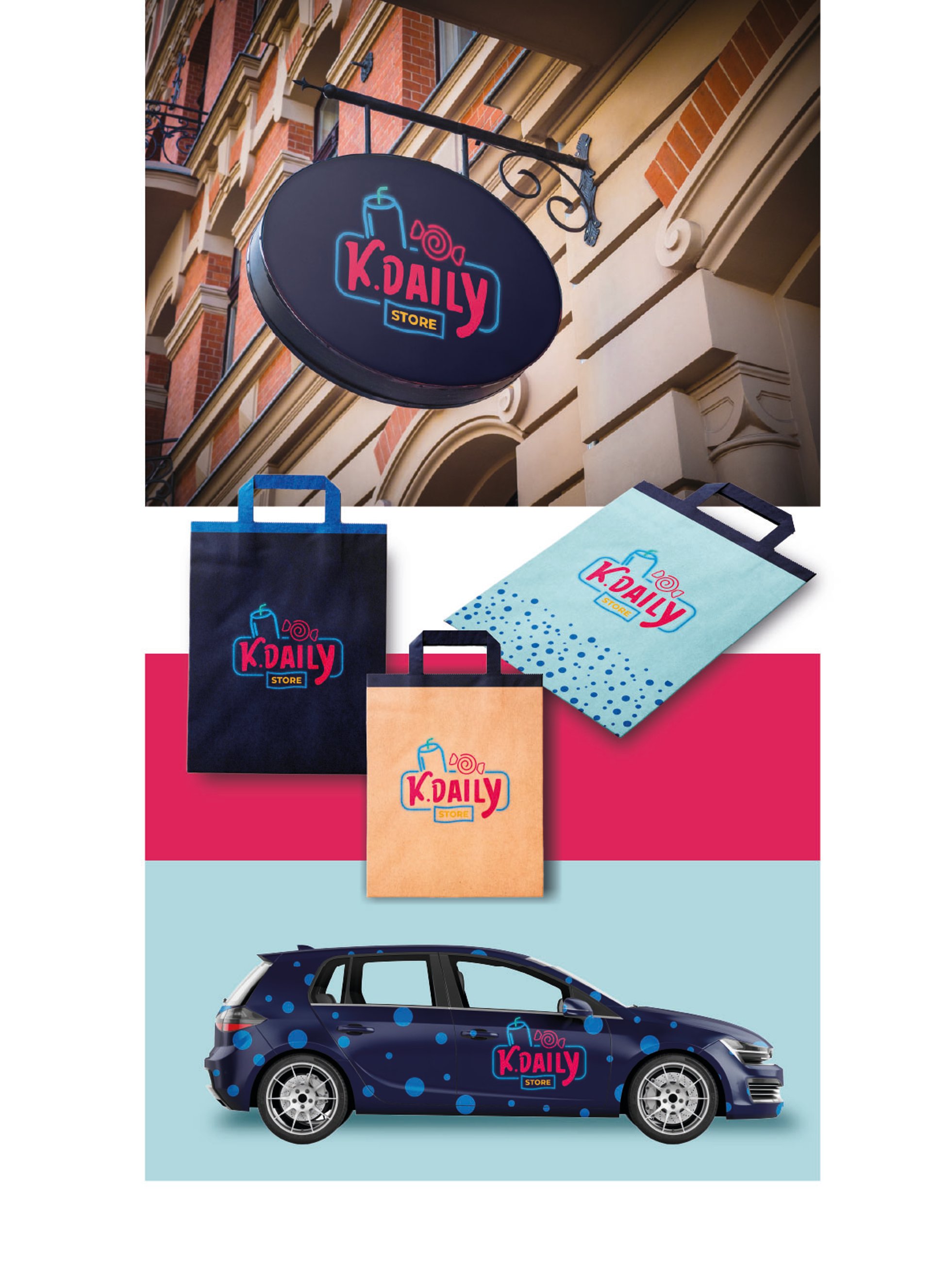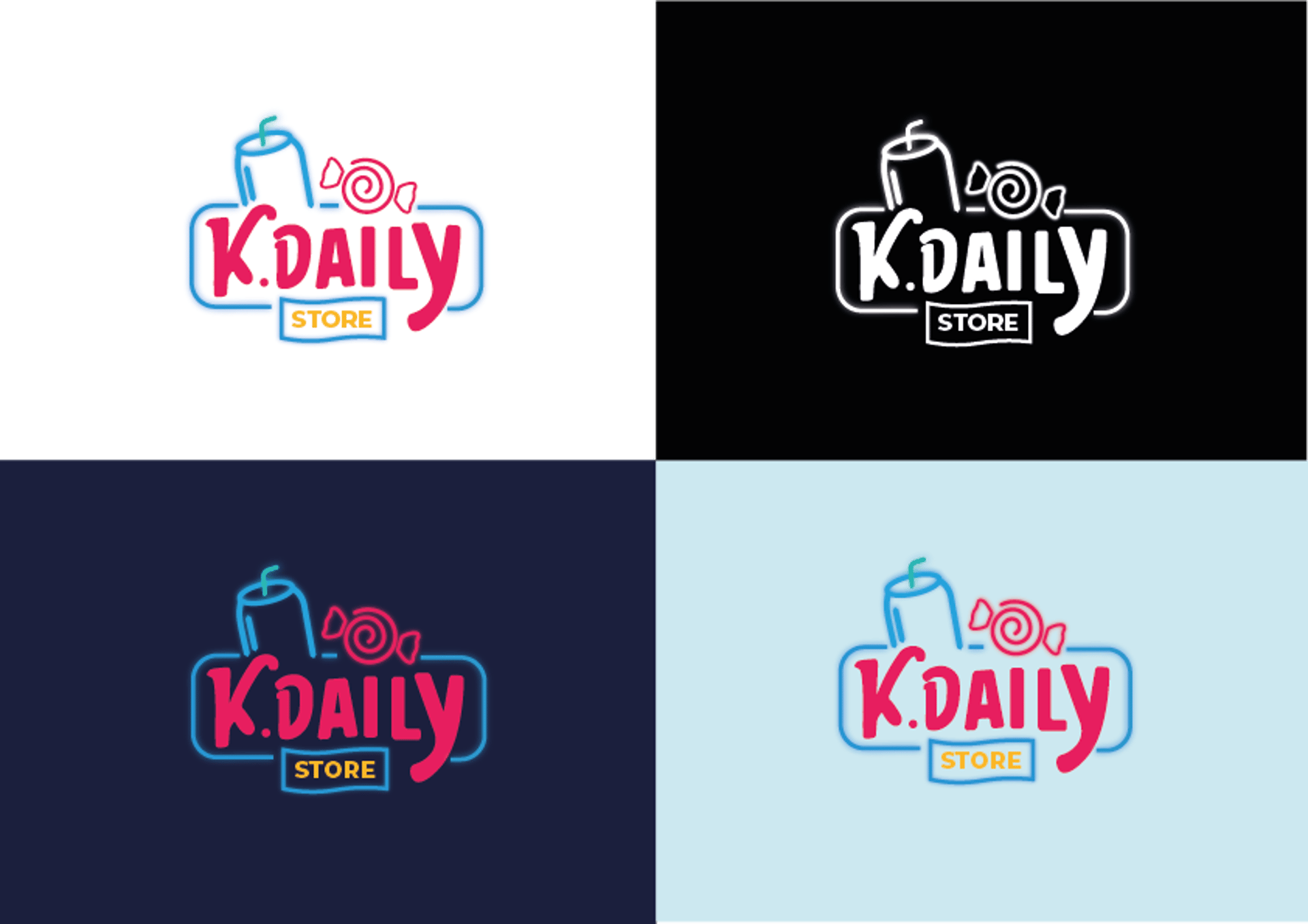 Les icônes stylisées sont intégrées de manière graphique, équilibrée et contemporaine, créant un univers à la fois fun, coloré et urbain, sans tomber dans le kitsch. Le logo traduit ainsi l’esprit de découverte, de diversité et de plaisir quotidien propre à K.DAILY STORE